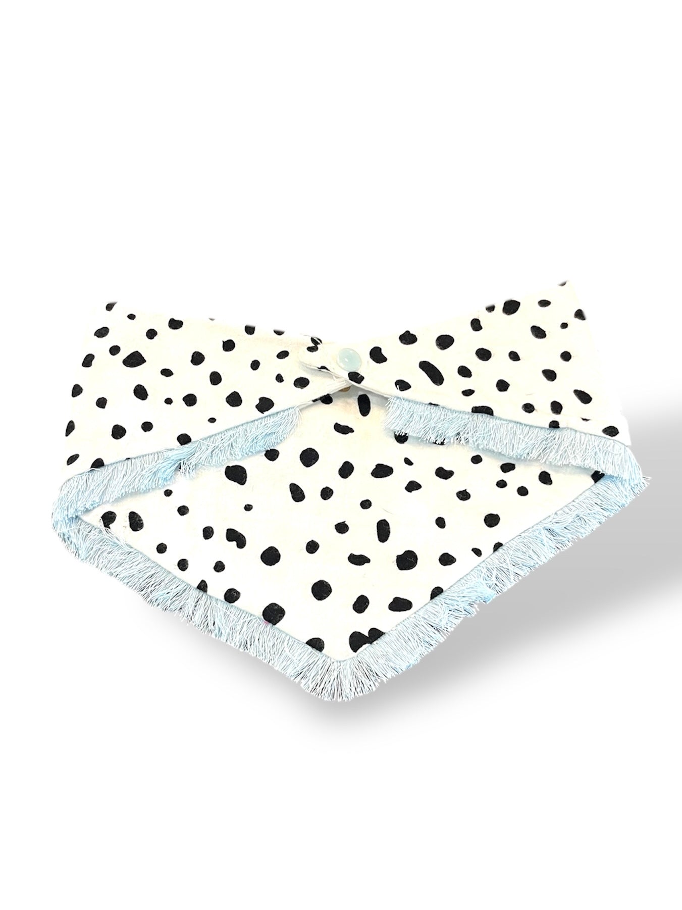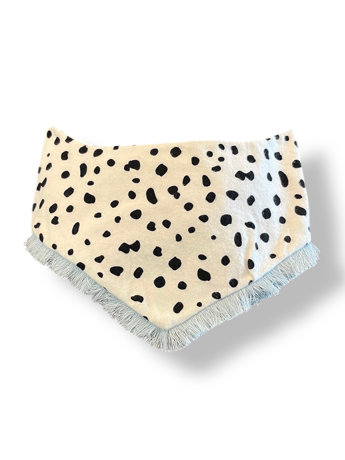 Add some flair to your pup’s wardrobe with this stylish, handmade dog bandana! Featuring a cozy fleece fabric with a fun Dalmatian print, this bandana ensures your furry friend stays both fashionable and comfortable. The playful blue fringe trim adds a pop of color and personality, making it the perfect accessory for any occasion.