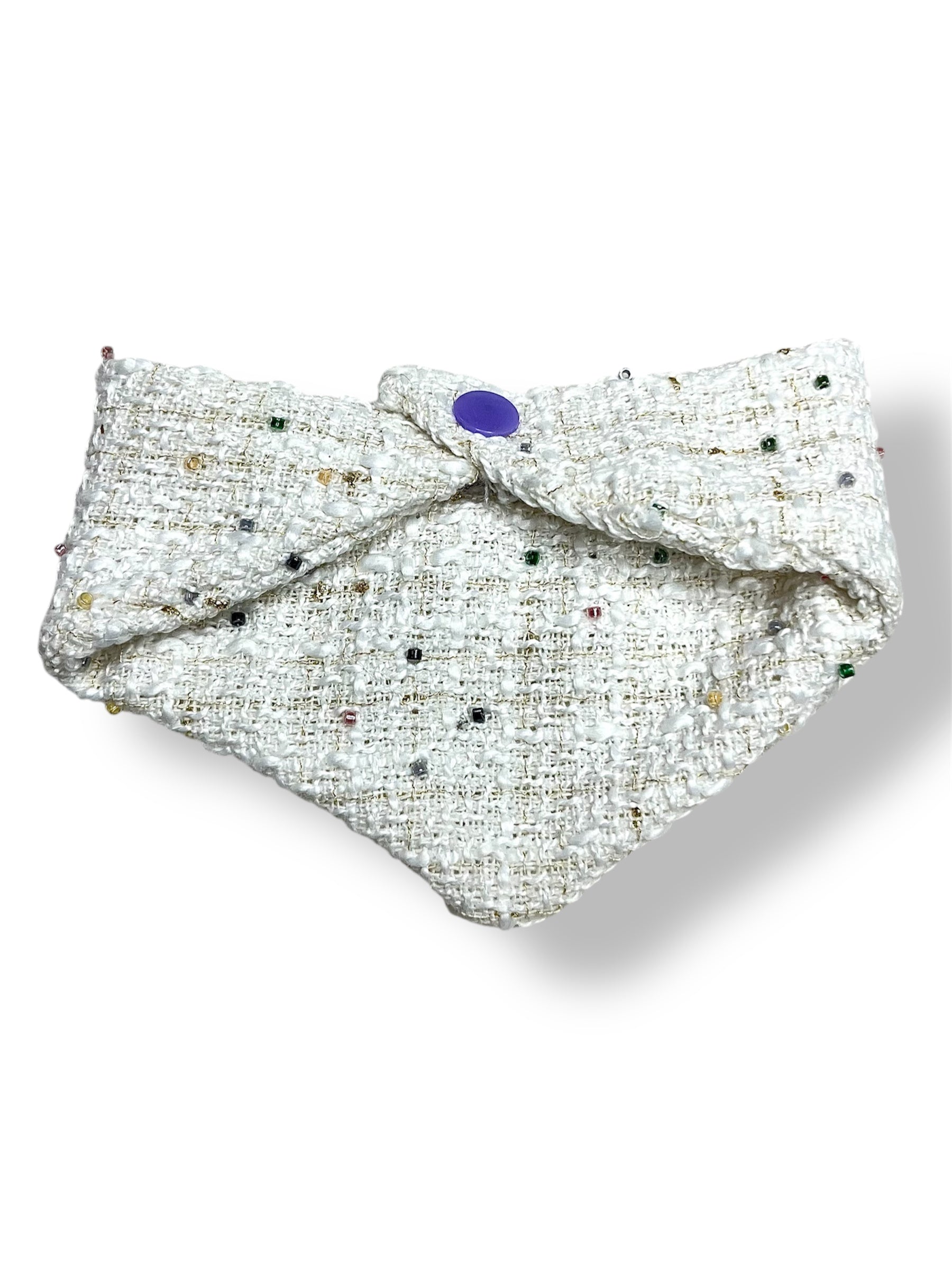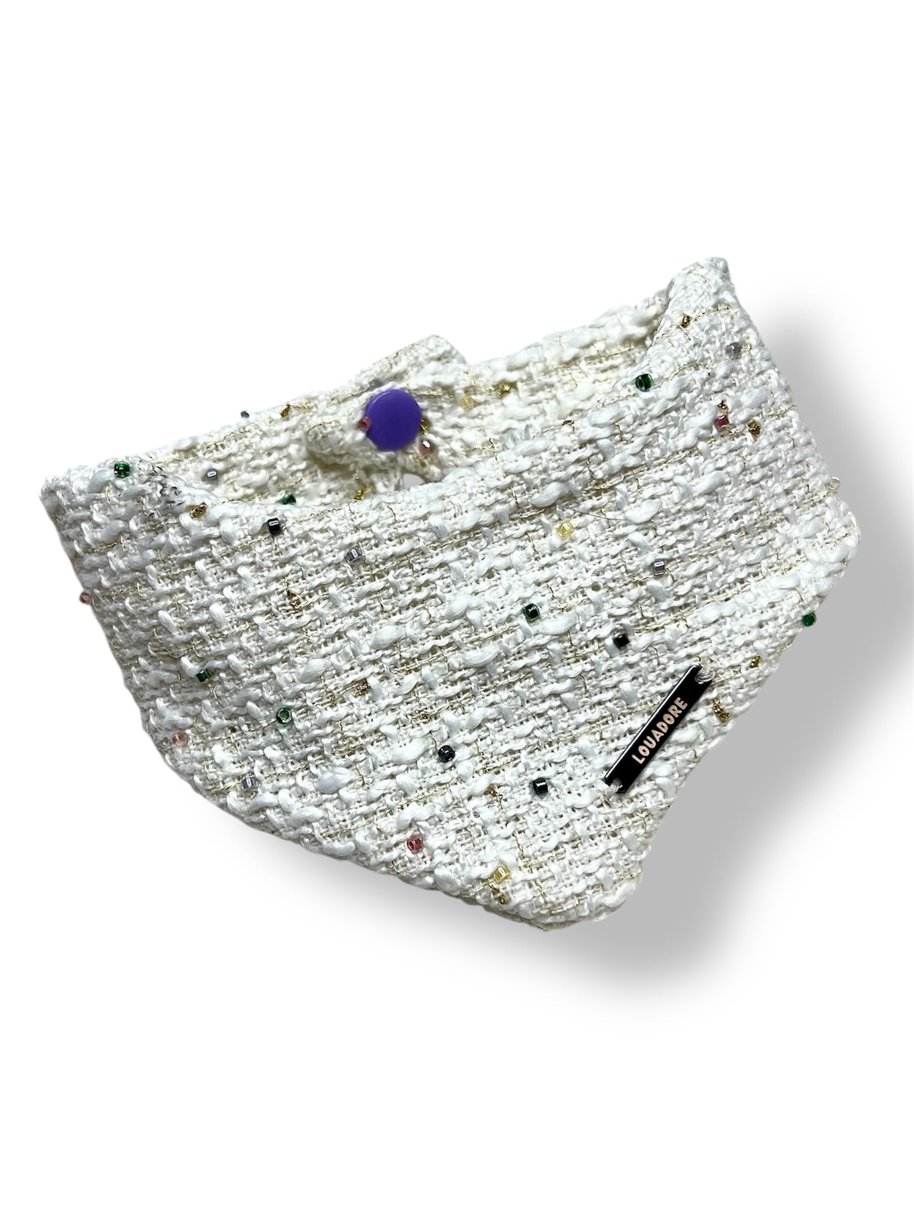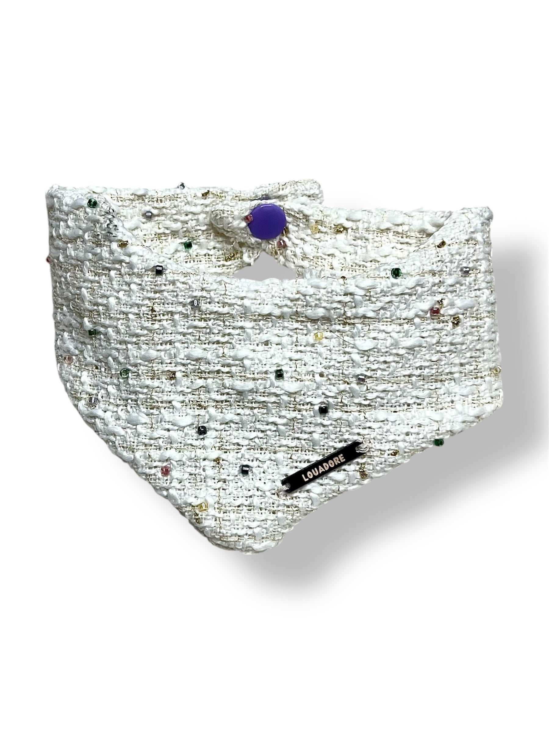 Let your pup shine like the star they are with the Sprinkles! Bandana—a handmade celebration of style and sweetness. Crafted from luxe white tweed and delicately dotted with colorful beads, this bandana is made for the most fashionable of furry guests. The curved neckline creates a refined fit, while the snap button closure keeps it secure (even during excited birthday zoomies).