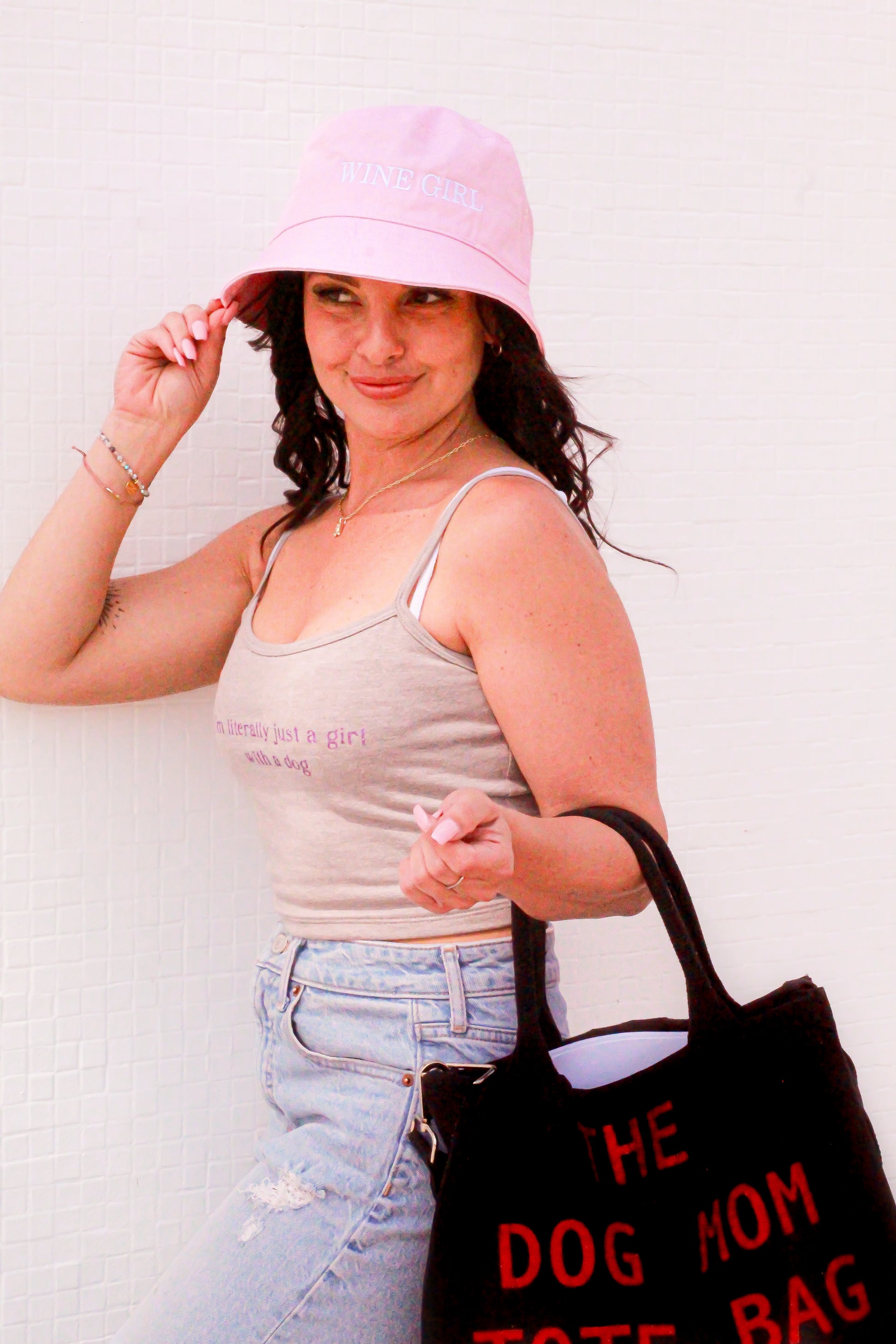 Your choice of Bold red, pink, or blue glitter script that reads “The Dog Mom Tote Bag”